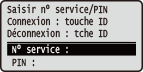 Si la gestion d'ID de service est activée ou si les ID d'administrateur système sont activés, vous devez vous connecter avant d'utiliser l'appareil. Lorsque l'écran de connexion s'affiche, utilisez la procédure ci-dessous pour saisir l'ID de service et le PIN.