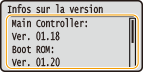 Vérification de la version du microprogrammeVous pouvez vérifier la version du microprogramme depuis le panneau de commande de l'appareil. Une fois la mise à jour du microprogramme effectuée, assurez-vous que celle-ci s'est correctement déroulée. Vérification de la version du microprogramme |
