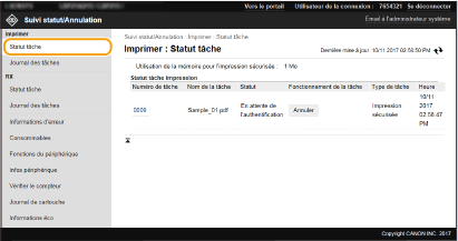 Tous les documents en cours d'impression ou sur le point de l'être figurent dans la liste, quel que soit le réglage choisi pour la gestion des numéros de service. Si vous avez saisi votre nom d'utilisateur en mode Utilisateur général, votre nom d'utilisateur ne s'affiche que sur les documents que vous imprimez. Cliquez sur [Numéro de tâche] pour les documents dont l'impression est suspendue et les documents sécurisés pour afficher leurs informations détaillées. Vous pouvez vérifier le nom de l'utilisateur et le nombre de pages sur le document imprimé. |