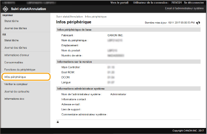 Les informations sur l'appareil et l'administrateur système s'affichent. Le nom de l'appareil et d'autres informations sur l'administrateur système affichés ici correspondent aux informations définies dans [Informations administrateur système] à la page [Gestion de l'utilisateur] ou dans [Réglages infos sur le périphérique] à la page [Gestion du périphérique].