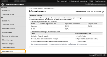 Le volume total mensuel d'impressions et la consommation électrique totale mensuelle sont affichés. Vous pouvez afficher l'écran Informations éco et changer les réglages pour économiser le papier et réduire la consommation électrique.