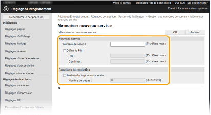 2 | Spécifiez les paramètres obligatoires. [Numéro de service] Saisissez l'ID de service à enregistrer. [Définir le PIN] Pour définir un code PIN, cocher la case et saisissez le même nombre dans les zones de texte [PIN] et [Confirmer]. [Fonctions de restriction] Vous pouvez limiter le nombre de pages à imprimer par service. Pour limiter le nombre de pages à imprimer, cochez la case associée au type souhaité et saisissez le nombre de pages approprié dans [Nombre de pages]. |