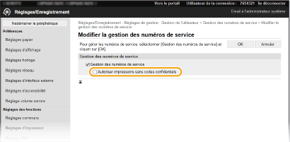 L'option "Impression depuis un ordinateur" est configurée par défaut pour que l'utilisateur puisse exécuter des tâches sans avoir à saisir un ID et un code PIN, même si la fonction de gestion d'ID de service est activée. Si vous voulez configurer le système de sorte que les fonctions ne puissent pas être utilisées sans la saisie d'un ID et d'un code PIN, appliquez la procédure suivante.