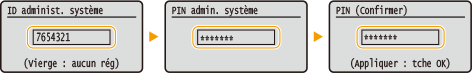 Configuration des réglages via l'interface utilisateur distanteLancez l'interface utilisateur distante en mode Administrateur système. Cliquez sur [Réglages/Enregistrement] [Gestion de l'utilisateur] [Informations administrateur système] [Modifier] et spécifiez les réglages nécessaires sur l'écran qui s'affiche.L'interface utilisateur distante permet d'enregistrer une multitude d'informations (coordonnées, commentaires de l'administrateur, lieu d'installation de l'appareil) ainsi que les réglages configurés à partir du panneau de commande. Les informations enregistrées sont visibles sur la page [Infos périphérique] de l'interface utilisateur distante. Vérification des informations sur l'administrateur système Connexion à l'appareilSi vous essayez d'accéder à des options nécessitant les droits d'administrateur, comme <Réseau> et <Réglages de gestion>, et que le compte d'administrateur système est configuré, l'écran de connexion suivant s'affiche. Connexion à l'appareil Vous devez également saisir le code PIN et l'ID d'administrateur système pour vous connecter à l'aide de l'interface utilisateur distante en mode Administrateur système. Démarrage de l'interface utilisateur distante |