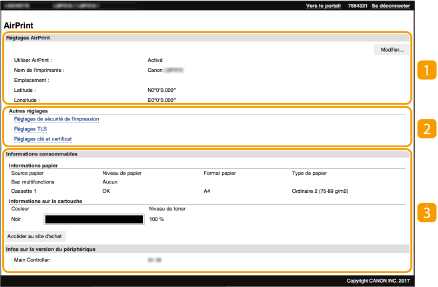 Vous pouvez afficher l'écran pour AirPrint, dans lequel vous avez accès non seulement aux réglages AirPrint, mais aussi aux informations sur les consommables tels que le papier et la cartouche de toner. En outre, vous pouvez configurer les paramètres de la fonction de sécurité.