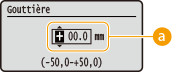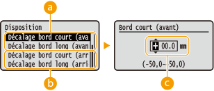 Décalez la position d'impression pour ajuster la marge de reliure pour l'appliquer au bord de reliure spécifié par <Emplacement reliure>. La valeur "00,0" ne produit aucun effet sur la marge de reliure.