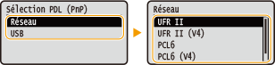 Sélectionnez un langage de description de page de sorte que l'appareil soit détecté en tant qu'imprimante compatible avec ce langage lorsqu'il est relié à un ordinateur par Plug-n-Play.