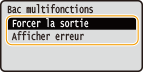 <Bac multifonctions> <Forcer la sortie>  <Afficher erreur> <Cassette 1> <Forcer la sortie>  <Afficher erreur> <Cassette 2>*1 <Forcer la sortie>  <Afficher erreur> |