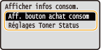 <Aff. bouton achat consom. (IU distante)> <Désactivé> <Activé>  <Réglages Toner Status> <Désactivé> <Activé>  <Aff. btn achat consommables.> <Désactivé> <Activé>  |