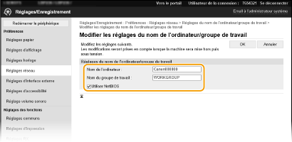 Le nom du groupe de travail est un nom rassemblant plusieurs ordinateurs de sorte que les fonctions de réseau de base, telles que le partage de fichiers, soient disponibles dans un réseau Windows. Saisissez le nom du groupe de travail auquel l'appareil appartient en caractères alphanumériques.