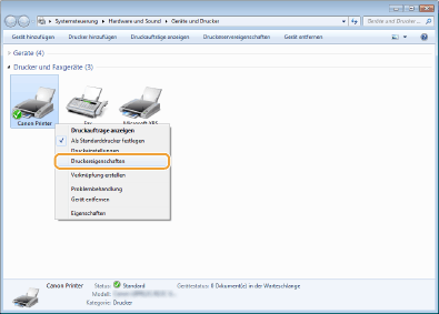 Klicken Sie mit der rechten Maustaste auf das Druckertreibersymbol für dieses Gerät, und klicken Sie auf [Druckereigenschaften] oder [Eigenschaften].