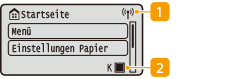 drücken. Geben Sie auf diesem Bildschirm Einstellungen an und speichern Sie Funktionen.![]() | Wi-Fi SymbolDieses Symbol wird angezeigt, wenn das Gerät mit einem Wireless LAN verbunden ist. Menge des in den Tonerpatronen verbliebenen TonersZeigt stufenweise die Menge des in den Tonerpatronen verbliebenen Toners an. Diese Anzeige ist ausgeblendet, wenn der Bildschirm Startseite aktiv ist. |