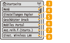 ![]() | <Menü><Funktionseinstellungen>, <Präferenzen> und viele andere Geräteeinstellungen beginnen mit dieser Schaltfläche. Liste der Menüeinstellungen <Einstellungen Papier>Über diese Schaltfläche werden Format und Typ des in die Papierkassette und das Mehrzweckfach eingelegten Papiers festgelegt. Angeben von Papierformat und -typ <Geschützter Druck>Mit dieser Funktion können Sie ein geschütztes Dokument drucken. Ein durch eine PIN geschütztes Dokument drucken (Geschützter Druck) <Mobiles Portal>Stellen Sie hierüber eine Verbindung zu einem Mobilgerät her. Verbinden mit Mobilgeräten <Anz.reih.f.(Starts.)>Hiermit können Sie die Reihenfolge ändern, in der die Schaltflächen des Bildschirms Startseite angezeigt werden. Anpassen des Bildschirms Startseite <Einst. Wireless LAN>Verwenden Sie diese Schaltfläche, um die Einstellungen für das Wireless LAN zu konfigurieren. Herstellen einer Verbindung zu einem Wireless LAN |