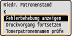 Wenn eine Meldung angezeigt wird Wenn Sie gerade drucken, können Sie mit dem Drucken des Originals fortfahren. Wenn eine Meldung angezeigt wird, während das Gerät ein I-Fax empfängt, druckt das Gerät nicht, so dass ein undeutlicher Druck vermieden wird. Um den Druckvorgang auch dann fortzusetzen, wenn der in der Tonerpatrone verbliebene Toner zur Neige geht, setzen Sie <Weiterdrucken, wenn Tonermenge niedrig.> auf <Ein>. <Weiterdrucken, wenn Tonermenge niedrig.>Geben Sie dies an, wenn eine Meldung angezeigt wird |