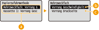 <Mehrzweckfach> <Vorrang Geschwindigkeit>  <Vorrang Druckseite> <Kassette 1> <Vorrang Geschwindigkeit>  <Vorrang Druckseite> <Kassette 2>* <Vorrang Geschwindigkeit>  <Vorrang Druckseite> |