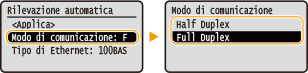 2 | <Modo di comunicazione> selezionare il modo di comunicazione.![]() <Half Duplex> Invia e riceve dati di comunicazione alternativamente. Selezionare quando la macchina è collegata a un dispositivo di rete che utilizza Half Duplex. <Full Duplex> Invia e riceve dati di comunicazione simultaneamente. Utilizzare questa impostazione per la maggior parte degli ambienti. |