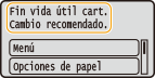 Este mensaje le informa de que un cartucho de tóner ha llegado al final de su vida útil. Se recomienda sustituir el cartucho por uno nuevo. Puede continuar imprimiendo, pero no puede garantizarse la calidad de impresión.