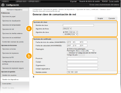 | | Cuando [SHA384] o [SHA512] están seleccionados en [Algoritmo de firma], [512 bits] no podrá seleccionarse como longitud de clave si está seleccionado [RSA] en [Algoritmo de clave]. |