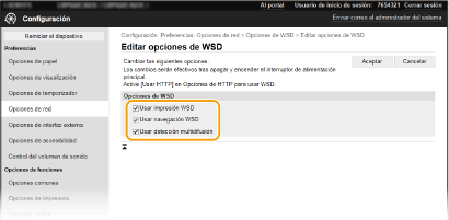 2 | Configure las opciones según sus necesidades. ![]() [Usar impresión WSD] Seleccione la casilla de verificación para imprimir a través de WSD. Cuando no utilice la impresión WSD, quite la marca de la casilla de verificación. [Usar navegación WSD] Seleccione la casilla de verificación para obtener información sobre el equipo desde un ordenador a través de WSD. Esta casilla de verificación se selecciona automáticamente cuando se marca la casilla de verificación [Usar impresión WSD]. [Usar detección multidifusión] Seleccione la casilla de verificación para configurar el equipo de forma que conteste a los mensajes de detección multidifusión. Cuando se quite la marca de la casilla de verificación, el equipo permanecerá en el modo de reposo incluso cuando los mensajes de detección multidifusión fluyan a través de la red. |