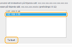 När [Avvisa] väljs för utgående filter Utgående multicast- och sändningspaket kan inte filtreras. Ta bort en IP-adress från undantag Välj IP-adress och klicka på [Ta bort]. |