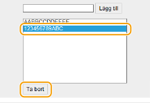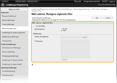 2 | Ange adressundantag. Ange MAC-adressen i textrutan [Adress att registrera] och klicka på [Lägg till]. Du behöver inte avgränsa adressen med bindestreck eller kolon. ![]() Söka efter inmatningsfel Om MAC-adresser anges felaktigt kanske du inte kan använda enheten från Fjärranvändargränssnittet och då måste du ställa in <MAC-adressfilter> på <Av>. <MAC-adressfilter> ![]() När [Avvisa] väljs för utgående filter Utgående multicast- och sändningspaket kan inte filtreras. Ta bort en MAC-adress från undantag Välj en MAC-adress och klicka på [Ta bort]. ![]() | ||||
