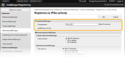 Om [Manuella IPv4-inställningar] eller [Manuella IPv6-inställningar] har valts för [Fjärradress], anger du IP-adressen som principen ska användas på. Du kan också ange ett adressintervall genom att infoga ett bindestreck mellan adresserna.