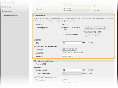 Markera kryssrutan för att aktivera PFS (Perfect Forward Secrecy) för IPSec-sessionsnycklar. Om du aktiverar PFS utökas säkerheten och samtidigt ökar kommunikationsbelastningen. Kontrollera att PFS också aktiverats för de andra enheterna.