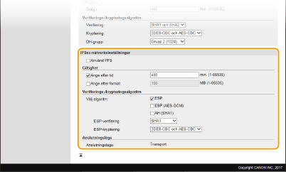 Ange inställningar för AH/ESP, som läggs till i paketen under IPSec-kommunikation. AH och ESP kan användas samtidigt. Du kan också välja om PFS ska aktiveras för ökad säkerhet.