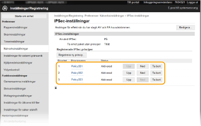 Ordna principerna som visas under [Registrerade IPSec-principer].