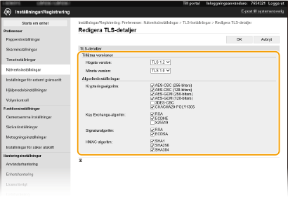 Använda kontrollpanelenDu kan även aktivera eller inaktivera TLS-krypterad kommunikation från <Meny> på skärmen Hem. <Använd fjärrgränssnitt> Starta fjärranvändargränssnittet med TLSOm du försöker starta fjärranvändargränssnittet när TLS har aktiverats kan en säkerhetsvarning visas gällande säkerhetscertifikatet. I så fall kontrollerar du att rätt webbadress har angetts i adressfältet och går sedan vidare för att öppna skärmen för fjärranvändargränssnittet. Starta Fjärranvändargränssnittet Använda TLS för att kryptera mottagning av I-faxOm POP3-servern har stöd för TLS kan du aktivera TLS för kommunikation med POP3-servern (Konfigurera mottagningsinställningar för I-fax). Mer information om POP3-servern kan lämnas av din Internet-leverantör eller nätverksadministratör. |