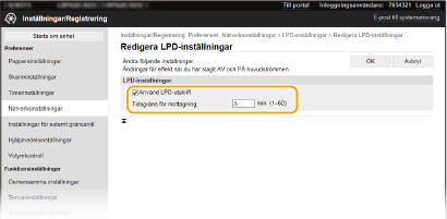 2 | Konfigurera eventuellt inställningarna. ![]() [Använd LPD-utskrift] Markera kryssrutan för att skriva ut via LPD. När LPD-utskrift inte används avmarkerar du kryssrutan. [Använd RAW-utskrift] Markera kryssrutan för att skriva ut via RAW. När RAW-utskrift inte används avmarkerar du kryssrutan. [Tidsgräns för mottagning] Ställ in ett värde som omstartstid för mottagning av data. Om mottagning av data inte fortsätter inom inställd tid avbryts utskriften. |
