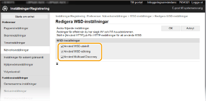 2 | Konfigurera eventuellt inställningarna. ![]() [Använd WSD-utskrift] Markera kryssrutan för att skriva ut via WSD. När WSD-utskrift inte används avmarkerar du kryssrutan. [Använd WSD-sökning] Markera kryssrutan om du vill hämta information om enheten från en dator via WSD. Kryssrutan markeras automatiskt när kryssrutan [Använd WSD-utskrift] är markerad. [Använd Multicast Discovery] Markera kryssrutan om enheten ska svara på Multicast Discovery-meddelanden. Om kryssrutan är avmarkerad stannar enheten i viloläge även om Multicast Discovery-meddelandena strömmar genom nätverket. |