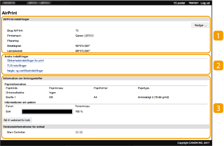Gør det muligt for dig at kontrollere de værdier, der er indtastet i AirPrint-indstillingerne, som f.eks. maskinens navn og lokation. Du kan klikke på [Rediger] for at ændre indstillingerne.