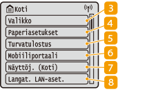 ![]() | <Valikko><Toimintoasetukset>, <Yleisasetukset> ja monet muut laitteen asetukset aloitetaan tällä painikkeella. Asetusvalikkoluettelo <Paperiasetukset>Tätä painiketta käytetään paperikasettiin ja monikäyttötasolle lisätyn paperin koon ja tyypin määrittämiseen. Paperin koon ja tyypin määrittäminen <Turvatulostus>Käytä tätä toimintoa turvatulostusasiakirjan tulostamiseen. PIN-koodilla suojattujen asiakirjojen tulostaminen (Turvatulostus) <Mobiiliportaali>Tämän avulla voit muodostaa yhteyden mobiililaitteeseen. Yhteys mobiililaitteisiin <Näyttöj. (Koti)>Tämän avulla voit muuttaa järjestyksen, jossa Koti-näytön painikkeet näytetään. Koti-näytön mukauttaminen <Langat. LAN-aset.>Käytä tätä painiketta, kun haluat määrittää langattoman lähiverkon asetukset. Yhdistäminen langattomaan lähiverkkoon |