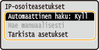 IP-osoitteen määrittäminen automaattisesti1 | Valitse <Automaattinen haku>. |
