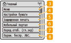 ![]() | <Меню>Данная клавиша позволяет задавать <Настройки функций>, <Настройки> и многие другие настройки аппарата. Список меню настройки <Настройки бумаги>Эта кнопка используется для указания формата и типа бумаги, загруженной в лоток для бумаги и в универсальный лоток. Указание формата и типа бумаги <Защищенная печать>Эта функция позволяет напечатать защищенный документ. Печать документа, защищенного PIN-кодом (защищенная печать) <Мобильный портал>Служит для установления подключения к мобильному устройству. Подключение мобильных устройств <Поряд.отоб. (гл.экр)>Служит для изменения порядка расположения кнопок на экране Главный. Настройка экрана Главный <Парам. беспр. ЛВС.>Эта кнопка служит для настройки параметров беспроводной локальной сети. Подключение к беспроводной локальной сети |