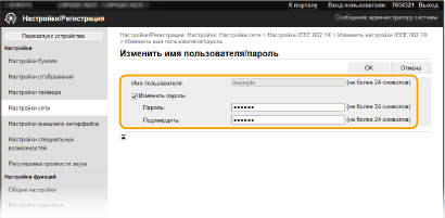 3 | Задайте имя пользователя и пароль. [Имя пользователя] Введите алфавитно-цифровые символы для имени пользователя. [Изменить пароль] Чтобы задать или изменить пароль, установите флажок и введите алфавитно-цифровые символы для нового пароля в обоих полях: [Пароль] и [Подтвердить]. |