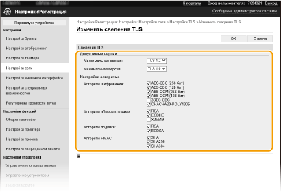 Можно включить шифрование для обмена данными между аппаратом и веб-браузером, используя протокол TLS (Transport Layer Security, безопасность транспортного уровня). Протокол TLS — это механизм шифрования данных, передающихся и получаемых по сети. При использовании Удаленного ИП для настройки параметров IPSec (Способ защищенного общего ключа), проверки подлинности IEEE 802.1X (TTLS/PEAP) или SNMPv3 необходимо включить протокол TLS. Чтобы использовать шифрованную связь TLS для Удаленного ИП, перед включением TLS необходимо задать "ключ и сертификат" (сертификат сервера), которые требуется использовать. Перед использованием TLS создайте или установите ключ и сертификат TLS (