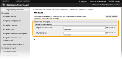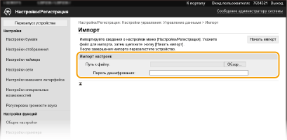 Данные параметров аппарата можно сохранить на компьютере (функция экспорта). Данные, сохраненные на компьютере, можно также зарегистрировать в аппарате (функция импорта). Данные, экспортированные из этого аппарата, можно импортировать на другой аппарат такой же модели. Это позволяет с легкостью копировать различные данные параметров на несколько аппаратов. Для использования этих функций необходимо войти в систему в режиме администратора. |
