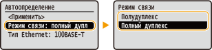 2 | <Режим связи> выберите режим связи.![]() <Полудуплекс> Попеременно отправляет и получает данные связи. Выберите, если аппарат подключен к сетевому устройству с использованием полудуплексной связи. <Полный дуплекс> Одновременно отправляет и получает данные связи. Этот параметр рекомендуется использовать для большинства сред. |