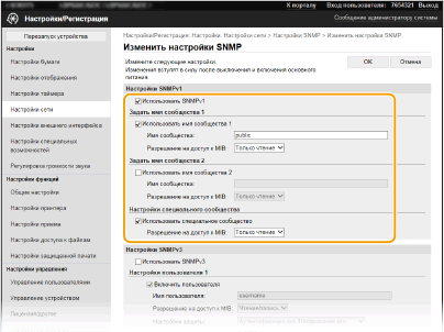 Простой протокол сетевого управления (SNMP) представляет собой протокол для мониторинга и контроля устройств связи в сети с помощью базы данных MIB. Аппарат поддерживает версию протокола SNMPv1 и версию с расширенными функциями безопасности SNMPv3. Статус аппарата можно проверить с помощью компьютера при печати документов или использовать для этого Удаленный ИП. Можно разрешить использование SNMPv1 или SNMPv3 по отдельности или одновременно. Укажите настройки для каждой версии в соответствии с особенностями сетевой среды и конкретными задачами.