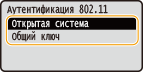 2 | Выберите метод проверки подлинности. ![]() <Открытая система> Задает тип проверки подлинности "Открытая система" (т. н. "открытая проверка подлинности"). <Общий ключ> В качестве пароля используется WEP-ключ. ![]() Если выбрано значение <Открытая система> При подключении аппарата к беспроводной локальной сети возникает ошибка аутентификации в том случае, если на беспроводном маршрутизаторе настроена аутентификация с помощью ключа совместного использования. В этом случае аппарат автоматически изменяет значение настройки на <Общий ключ> и выполняет повторную попытку подключения. |