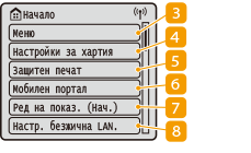 ![]() | <Меню><Настройки на функция>, <Предпочитания> и много други настройки на устройството се стартират от този бутон. Списък на меню с настройки <Настройки за хартия>Този бутон се използва за указване на формата и типа на хартията, заредена в касетата за хартия и многофункционалната тава. Задаване на формат и тип на хартията <Защитен печат>Използвайте тази функция за отпечатване на защитен документ. Отпечатване на документ, защитен с PIN код (Защитен печат) <Мобилен портал>Използвайте този бутон за установяване на връзка с мобилно устройство. Свързване с мобилни устройства <Ред на показ. (Нач.)>Позволява ви да промените реда, в който се показват бутоните на екрана Начало. Персонализиране на екрана Начало <Настр. безжична LAN.>Използвайте този бутон, за да конфигурирате настройките за безжична LAN. Свързване към безжична LAN мрежа |