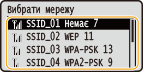 Можна здійснити пошук маршрутизаторів бездротової локальної мережі (або точок доступу), доступних для підключення, і вибрати один на дисплеї апарата. Як мережевий ключ введіть ключ WEP або PSK. Перш ніж вибрати маршрутизатор бездротової локальної мережі, перевірте й запишіть потрібні для налаштування відомості, зокрема ідентифікатор SSID та мережевий ключ (