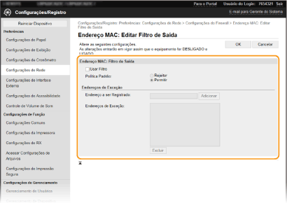 Se os endereços MAC não forem introduzidos corretamente, pode não conseguir aceder à máquina a partir da UI Remota; nesse caso, será necessário definir <Filtro de Endereço MAC> para <Desativ.>. <Filtro de Endereço MAC>