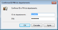 Quando tenta enviar um trabalho a partir de um computador com a gestão de ID de departamento ativada, aparece o seguinte ecrã pop-up (a não ser que a caixa de verificação [Confirmar ID/PIN do departamento ao imprimir] não esteja marcada):