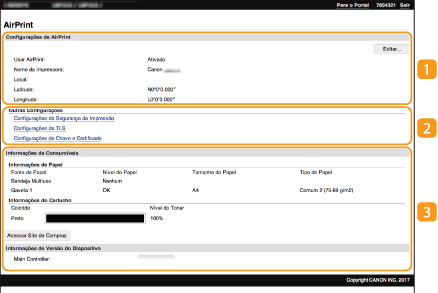 Pode aceder ao ecrã de AirPrint, no qual pode aceder às definições de AirPrint e também ver informações relativas aos consumíveis, como o papel e a cartridge de toner. Além disso, pode configurar as definições das funções de segurança.