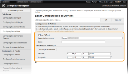Permite verificar os valores introduzidos nas definições de AirPrint, como o nome e a localização da máquina. Pode clicar em [Editar] para alterar as definições.