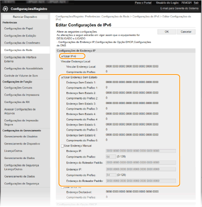 Os endereços IPv6 da máquina podem ser configurados através da UI Remota. Antes de definir endereços IPv6, verifique as definições de endereço IPv4 (Ver as definições de IPv4). É necessário configurar as definições corretas de IPv4 para poder utilizar endereços IPv6. A máquina pode utilizar os seguintes endereços IPv6: