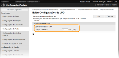 Selecione a caixa de verificação para imprimir via RAW. Quando não pretender utilizar a impressão através de RAW, desmarque a caixa de verificação. [Tempo Limite RX]